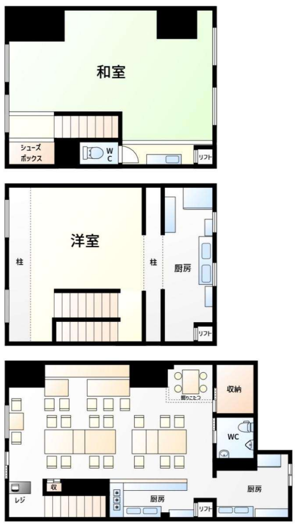 1階は入りやすい客席、2階・3階は団体や貸切利用にも対応可能。